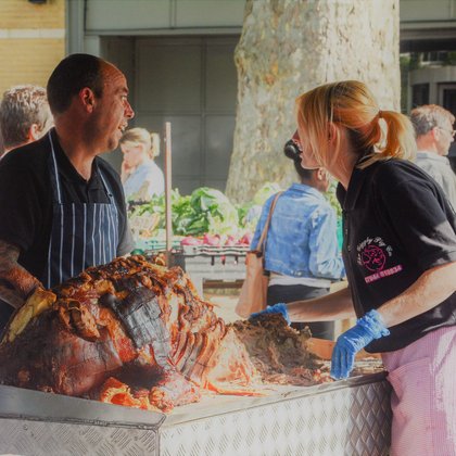 Our dog park is probably the most instagramed part of the farmers' market! We’re right on the heath; come in before or after jogging or walking the dog. Regulars make a bee line for their favourite stalls including Fiveways Fruit Farm for asparagus and soft fruit, Levain Bakery and Astons for brilliant sour dough bread, The Potato Shop for their range of spuds, and Brambletye for biodynamic eggs, juice, fruit and veg. There's free range poultry from Fosse, organic meat from Galileo Farm, Wild Country Organics range of salad leaves, hot food from Mumbai Mix and Pasta E Basta plus a range of fermented drinks and preserves and much more.